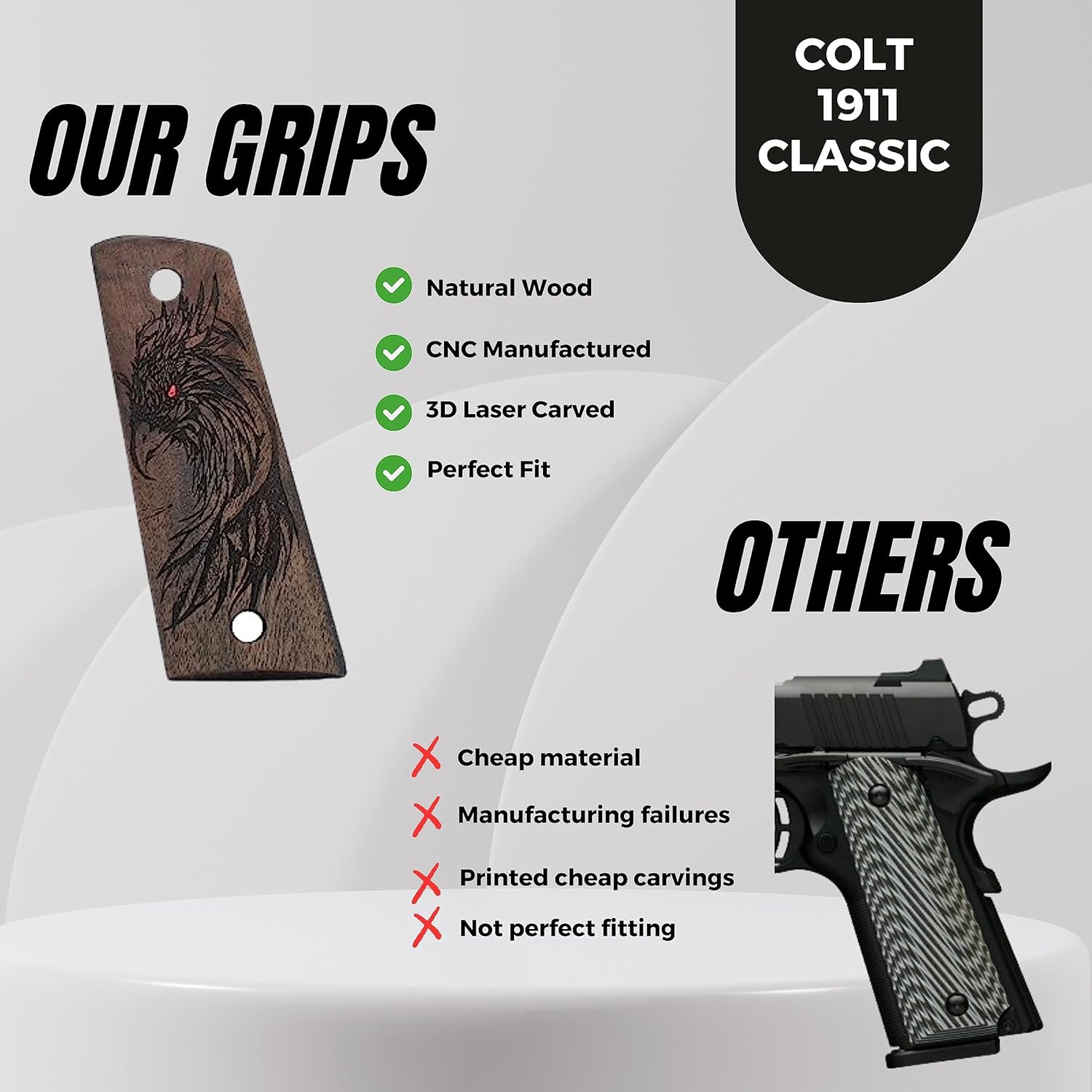 If you are looking for a solid gun handle with a classy look, the wood handles are your choice, they are also very useful and functional, less likely to drag on clothing or print when carrying concealed STYLISH DESIGN