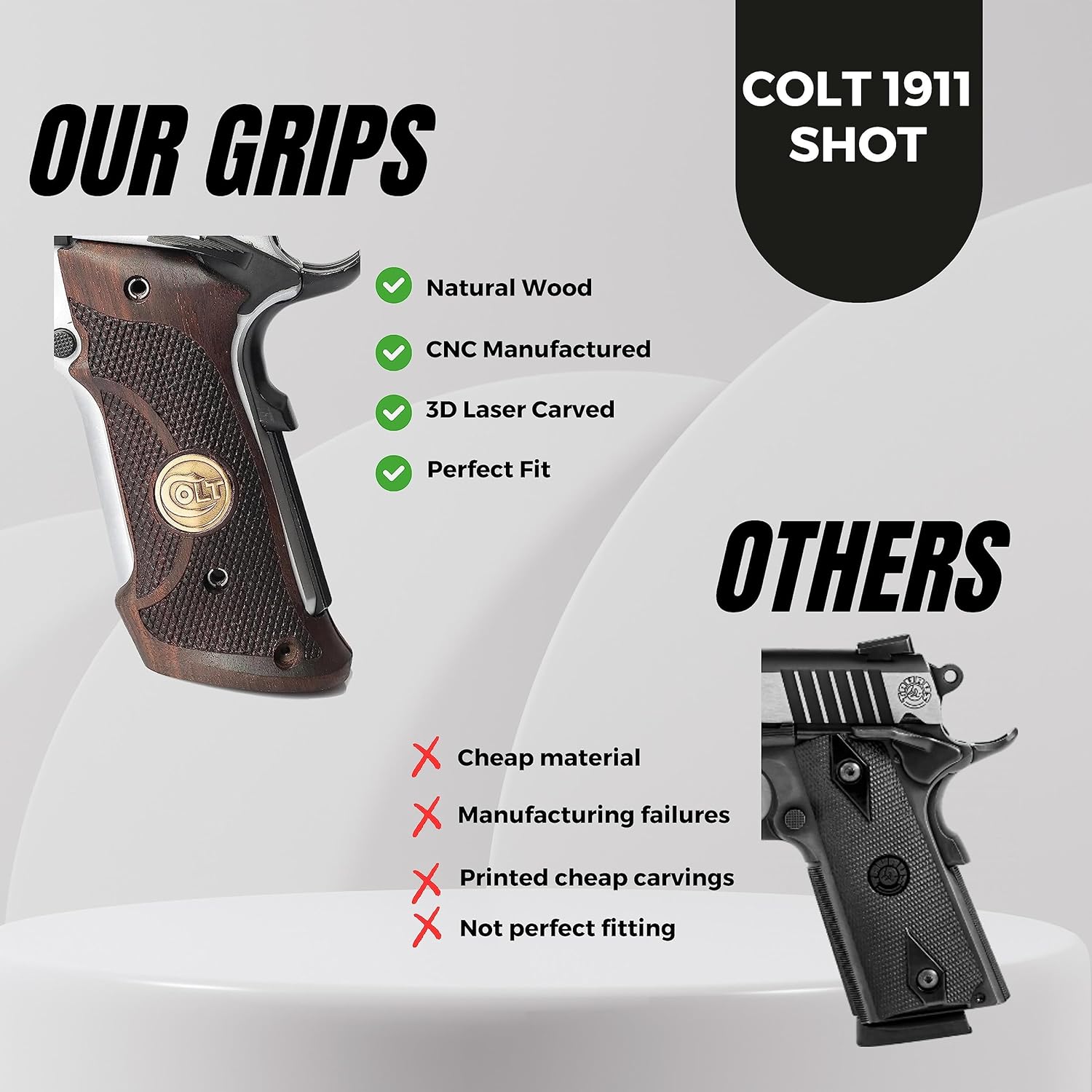 If you are looking for a solid gun handle with a classy look, the wood handles are your choice, they are also very useful and functional, less likely to drag on clothing or print when carrying concealed STYLISH DESIGN