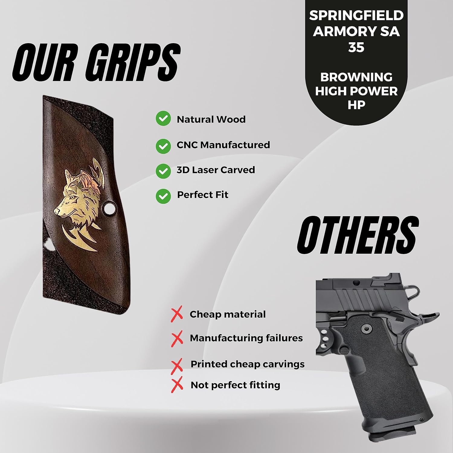 If you are looking for a solid gun handle with a classy look, the wood handles are your choice, they are also very useful and functional, less likely to drag on clothing or print when carrying concealed STYLISH DESIGN