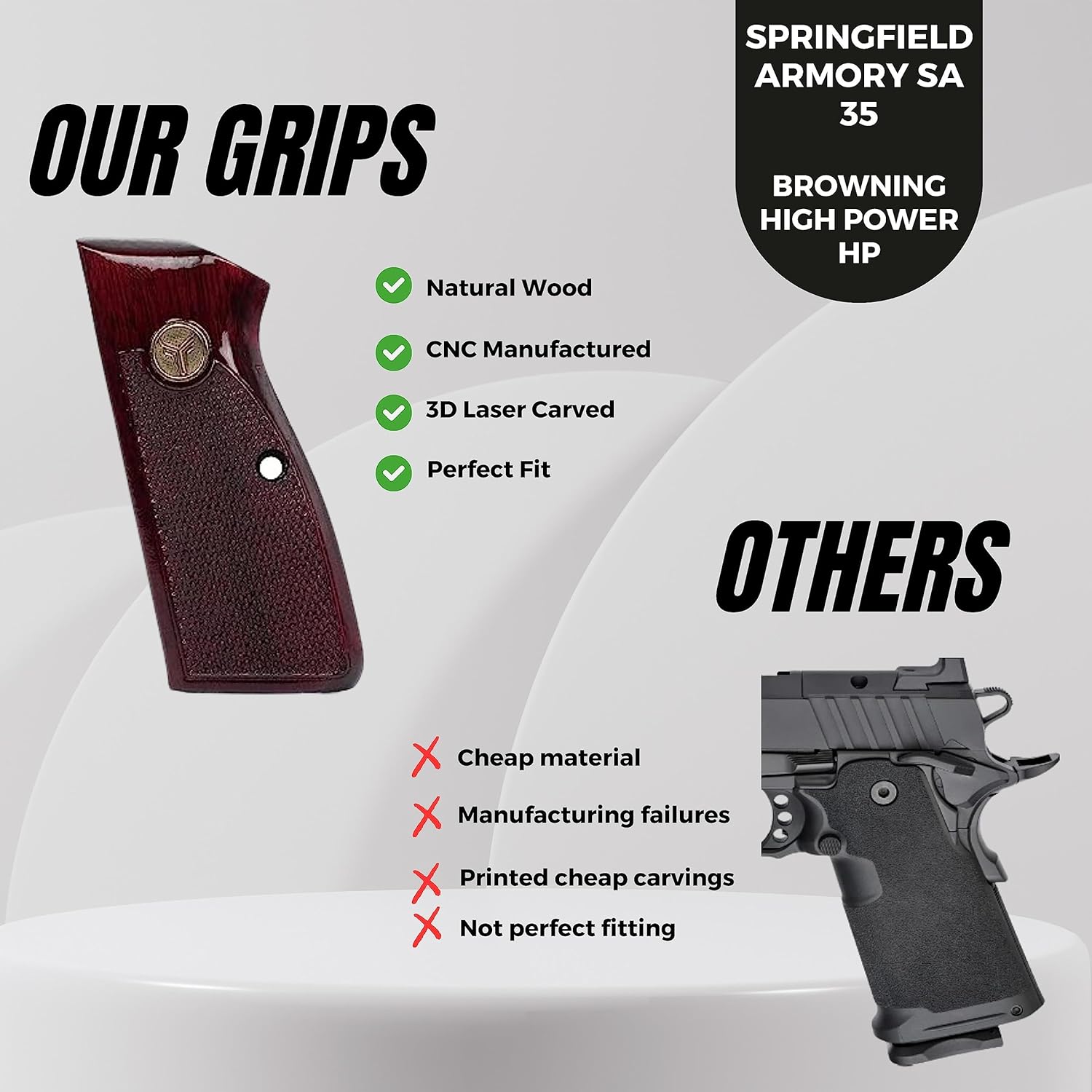 If you are looking for a solid gun handle with a classy look, the wood handles are your choice, they are also very useful and functional, less likely to drag on clothing or print when carrying concealed STYLISH DESIGN